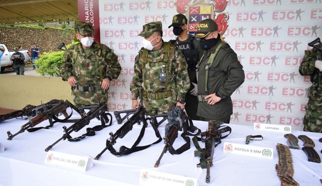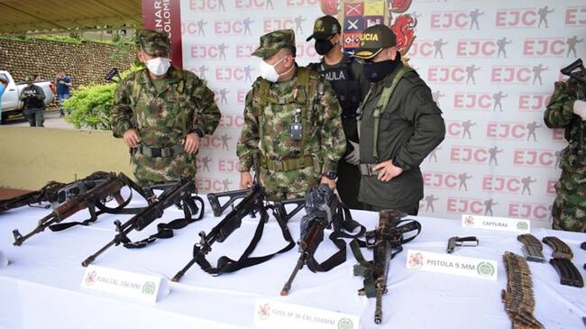 A estas personas se les incautaron seis fusiles, una ametralladora –M60-A4, dos pistolas, abundante munición de diferente calibre, un chaleco multipropósito con proveedores, equipos de comunicación, ocho equipos de campaña, boletas extorsivas, un computador y material de intendencia.