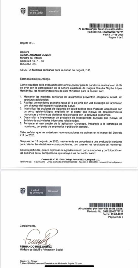 Caracol Radio conoció que el Gobierno Nacional está ultimando los detalles de una nueva directriz en la que recomienda a los alcaldes de Bogotá y Cali, extender el aislamiento obligatorio hasta el próximo 15 de junio, para evitar que se dupliquen los contagios de COVID-19.