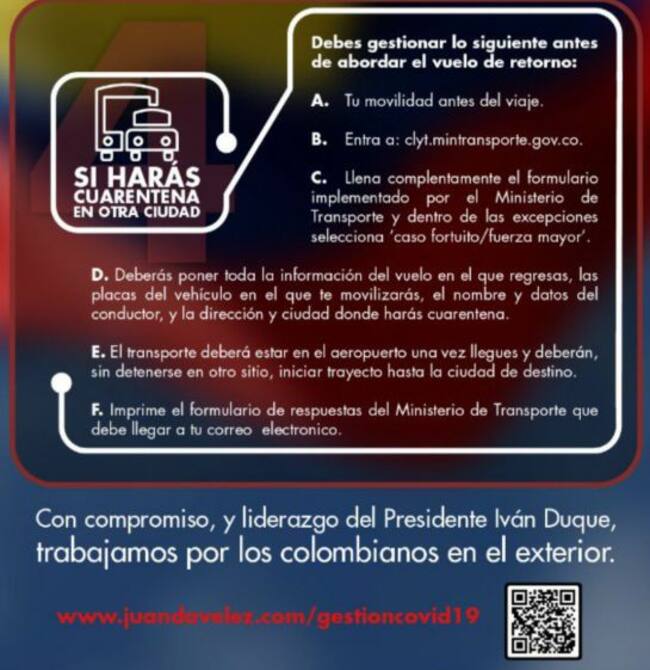 Para que los connacionales atrapados en distintas partes del mundo puedan dirigirse a sus ciudades donde residen, una vez llegan al aeropuerto El Dorado, deben solicitar, previo a su viaje, las autorizaciones al Ministerio de Transporte, en el enlace: clyt.mintransporte.gov.co, donde llenarán el formulario propuesto, incluyéndose dentro de las excepciones como 'caso fortuito/de fuerza mayor'.