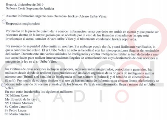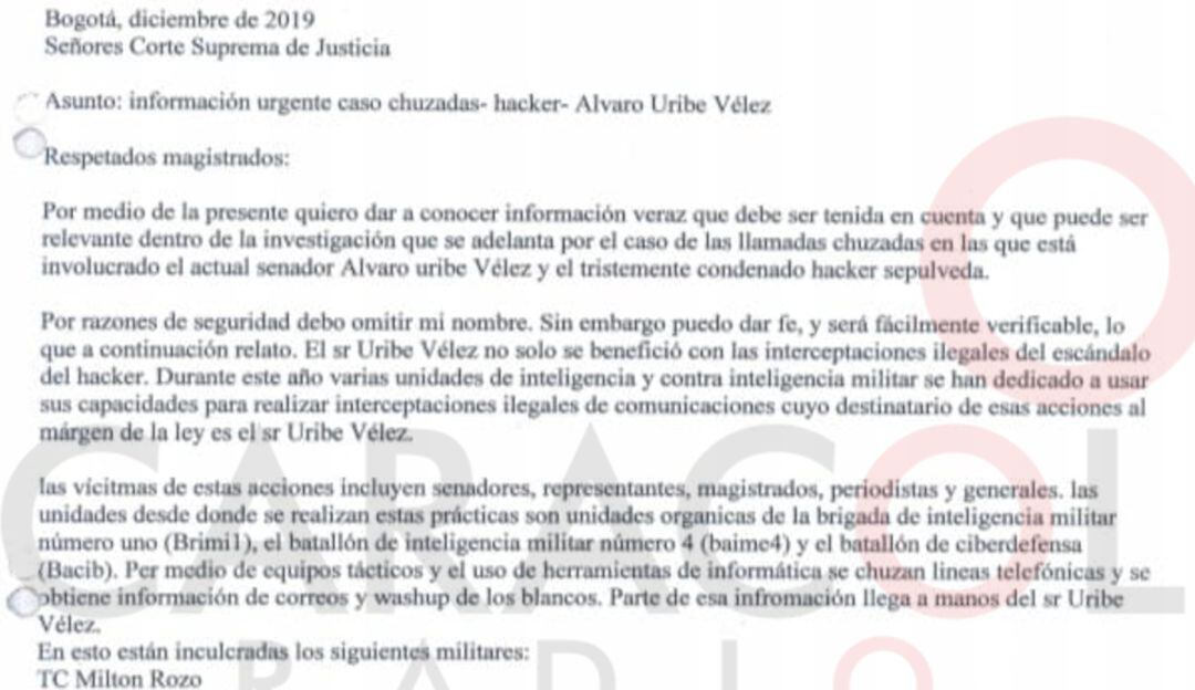 De acuerdo con la Corte Suprema de Justicia, la indagación se inició luego de que a la Corte llegó un correo, que indicaba que la información recaudada por la inteligencia militar en procedimientos irregulares, presuntamente tenía como destinatario al senador Álvaro Uribe Vélez