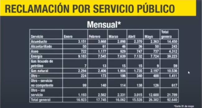 Avendaño informó que los servicios con más quejas en esos dos meses fueron los de Energía (14.856), Acueducto (4.733) y Gas Natural (3.932). 2