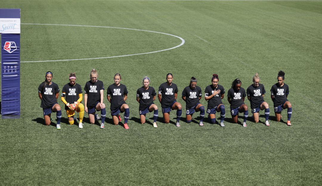Los jugadoras se alinearon en la línea media del campo y todas se arrodillaron durante el himno nacional antes del juego, que marcó el inicio de este deporte tras la suspensión de más de tres meses por la pandemia del coronavirus.