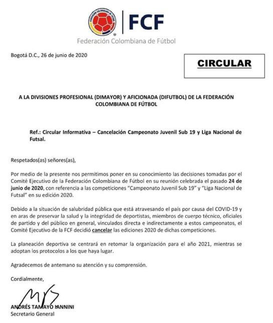 La Federación Colombiana de Fútbol (FCF) publicó este sábado una circular en la cual informó que fue cancelado el Campeonato Juvenil Sub-19 y la Liga Nacional de Futsal de este año producto de la pandemia del coronavirus.