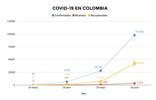 Hoy 30 de junio el país tiene 97.846 contagios. 3.334 muertes. 42.073 recuperados. Se han procesado 778.001 pruebas analizadas. Es decir, que en 8 días los casos incrementaron en un 33%; las muertes en un 39%, los recuperados 38% y las pruebas analizadas en un 23%. Con estos totales, el índice de letalidad en Colombia de la enfermedad es del 3,41%.