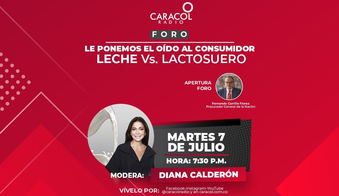 Un gran debate con Demogán como demandante, la Dirección de Alimentos y bebidas del INVIMA, las investigaciones y control político del Senador Jorge Robledo, Red Papaz, reconocidos nutricionistas de la Academia Nacional de Medicina y será el mismo Procurador General de la Nación, Fernando Carrillo Flórez, quién hablará sobre el mecanismo constitucional de la Acción Popular que faculta a los ciudadanos para acudir ante un juez y solicitar la protección de los derechos e intereses colectivos que se encuentren amenazados o vulnerados. Todos ellos haran parte del Foro Leche Vs Lactosuero, moderado por Diana Calderón para hablar sobre el uso del suero lácteo en la leche que consumen muchos colombianos.