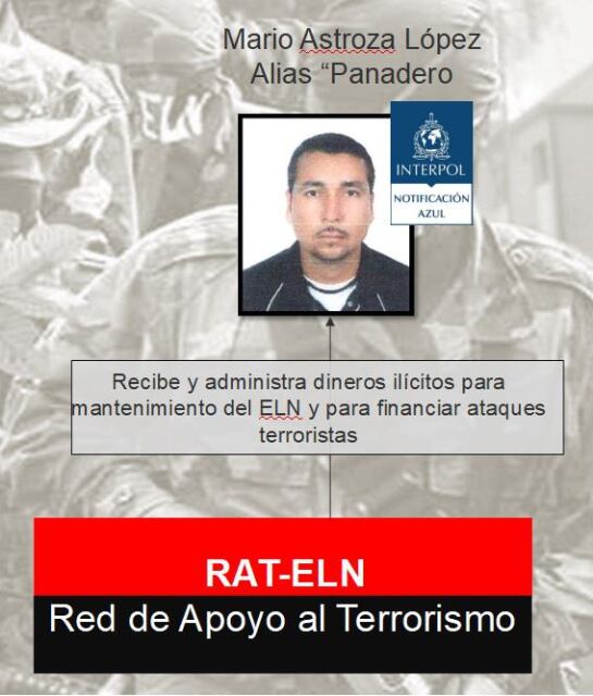 Caracol Radio conoció que Mario Astroza López, alias 'El Panadero', sería el subjefe de la comisión de finanzas del Frente Oriental de Guerra del ELN, y administraba los dineros ilícitos desde varias comercializadoras de quesos que se crearon para financiar múltiples atentados, entre estos el de la Escuela de Cadetes, según concluyeron investigadores de la Fiscalía.