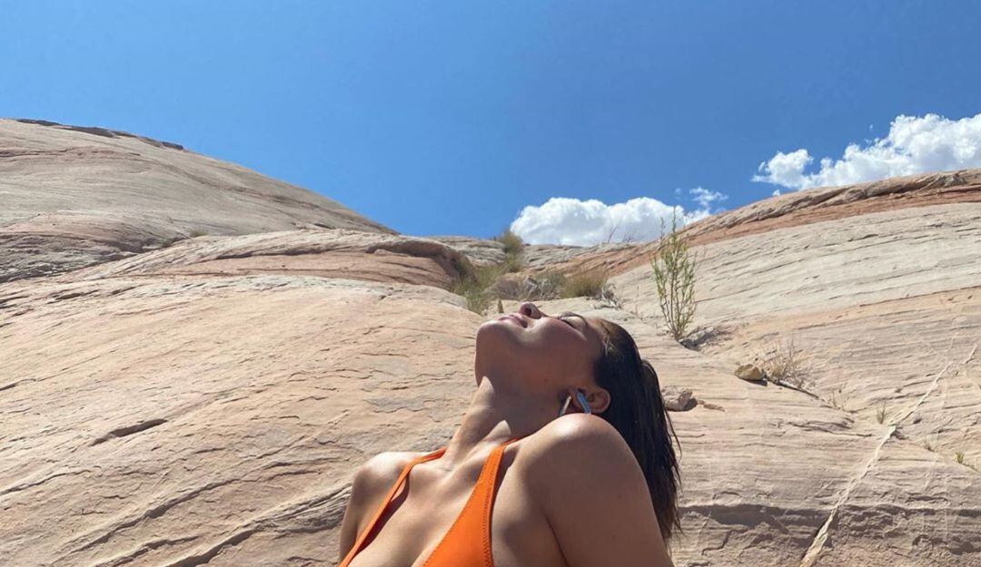 En su más reciente publicación, la estrella de televisión y empresaria aparece en el desierto usando un bikini color naranja y tomando el sol en medio del desierto.