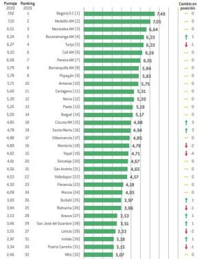 Por su parte, Yopal retrocede cuatro puestos respecto a 2019. Así mismo, Montería y Leticia pierden dos posiciones, mientras que Tunja, Riohacha y Puerto Carreño pierden un puesto frente a 2019.