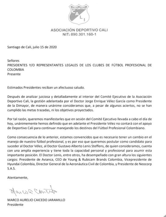 Deportivo Cali determinó, luego de sostener una reunión virtual con los miembros de su Comité Ejecutivo, retirar, de manera unilateral, su apoyo a Jorge Enrique Vélez como presidente de la Dimayor.