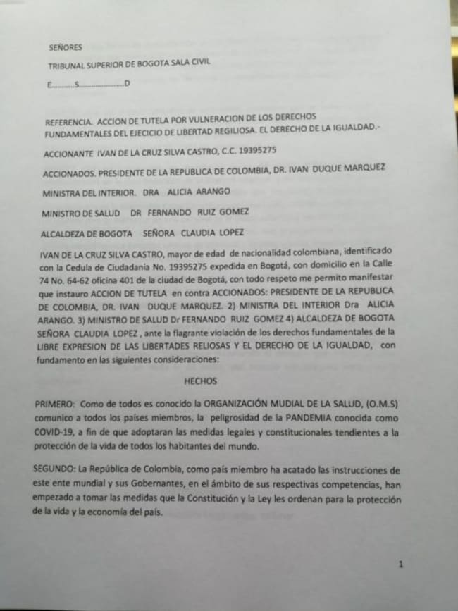 Ante el Tribunal Superior de Bogotá fue radicada una tutela contra el presidente de la República, Iván Duque; la ministra del Interior Alicia Arango; El ministro de Salud Fernando Ruiz; y la alcaldesa de Bogotá, Claudia López, por restringir el acceso a las iglesias y templos de culto en medio de la pandemia del coronavirus.
