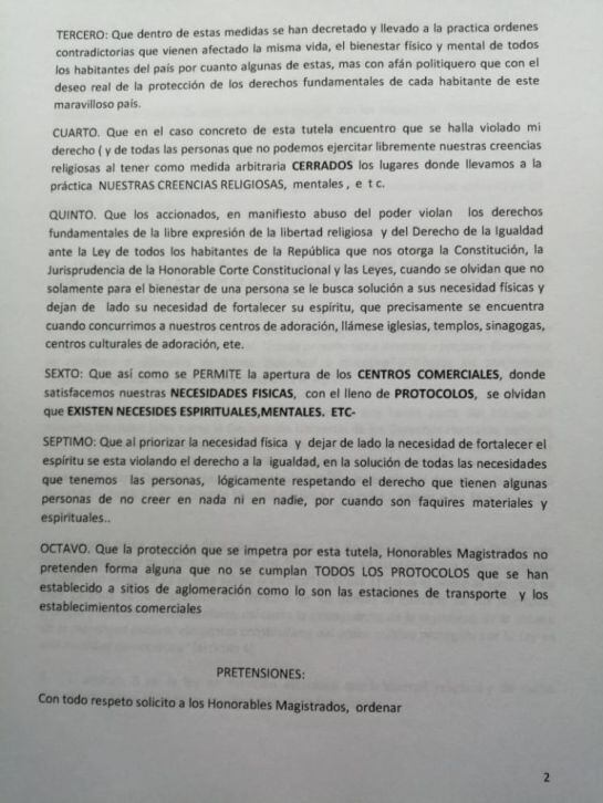 La acción judicial, alega que se permitió la reapertura de los Centros Comerciales para satisfacer las necesidades físicas con el lleno de protocolos, pero que se olvidaron de las necesidades espirituales. y por ello pide a los magistrados del Tribunal que se ordene la reapertura de iglesias y templos de culto.