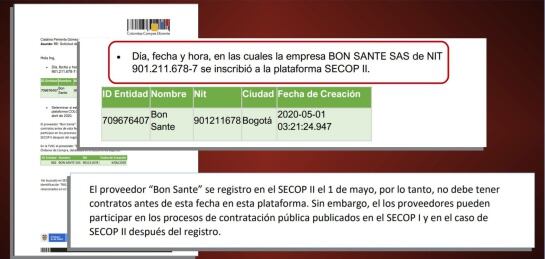 Consultado por Caracol Radio, el SECOP II confirmó que la empresa BON SANTE SAS con NIT 901.211.678-7 se inscribió a esa Plataforma de Contratación Pública el 01 de mayo de 2020.