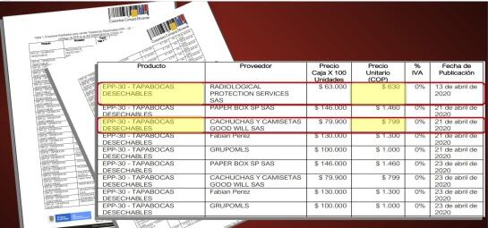De acuerdo con ese documento, la Contraloría General compró a BON SANTE SAS tapabocas a $1.600 la unidad. Según Colombia Compra Eficiente, para abril había oferentes con precios más bajos.