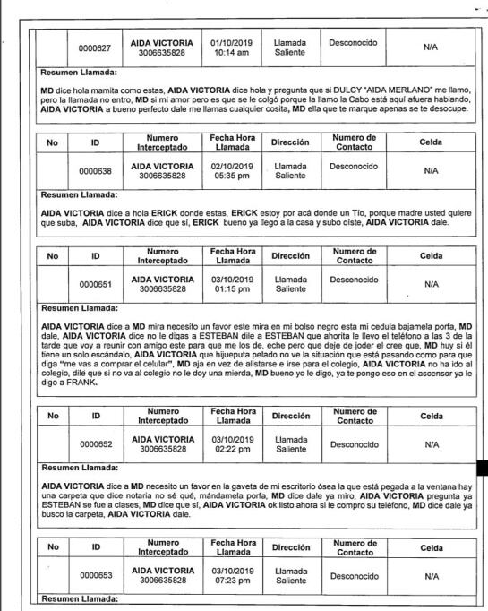 El informe de Policía judicial consigna las llamadas que entablaron la excongresista Aída Merlano, hoy prófuga y refugiada en Venezuela, y su hija, Aida Victoria, el 1 de octubre entre las 9:27 am y las 10:47 am.