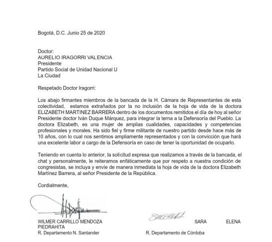En la carta, que se conoció fue dirigida al presidente del partido Unidad Nacional, Aurelio Iragorri, 7 representantes manifestaron estar "extrañados con la no inclusión de su hoja de vida", por lo que hicieron solicitaron 'expresamente' que "por respeto a nuestra condición de congresistas, se incluya y envíe de manera inmediata al presidente Iván Duque".