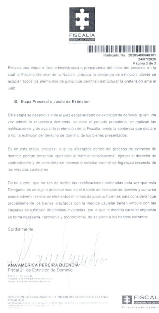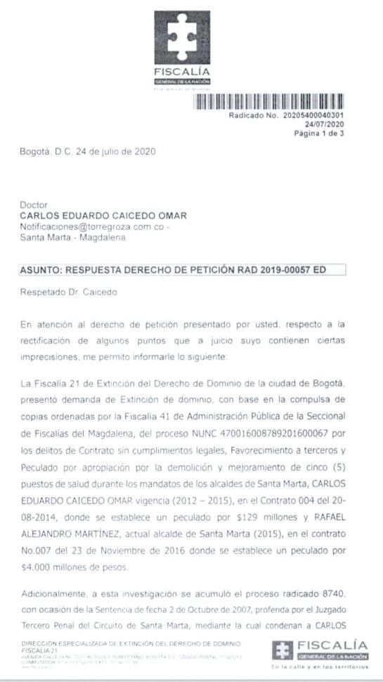 En una respuesta a un derecho de petición, la Fiscalía le dijo al gobernador del Magdalena Carlos Caicedo, que no hay lugar a rectificación a un comunicado expedido el pasado 26 de junio, en el que se dio a conocer la orden de medidas cautelares con fines de extinción de dominio a 11 bienes que serían de su propiedad, porque es ante un juez de extinción de dominio donde se debate este asunto.