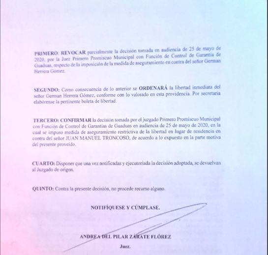 El juzgado promiscuo de Guaduas, Cundinamarca revocó la decisión de primera instancia y ordenó la libertad del alcalde de ese municipio Germán Herrera Gómez, al considerar que la Fiscalía no aportó pruebas que permitieran inferir que podría obstruir la investigación en su contra.