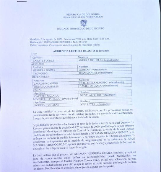 De otro lado, el mismo juez ratificó la detención domiciliaria contra el Secretario General y de Gobierno de Palocabildo, Tolima, José Manuel Troncoso.