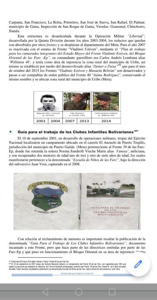 Por ejemplo, reposan en el informe las cartillas infantiles donde las Farc le enseñaban a los menores de edad el lenguaje militar con sesgo político, están los testimonios de quienes fueron reclutados siendo menores de edad y ahora adultos, y se documenta que el Frente Sur, el Frente Oriental y Frente Occidental fueron de las estructuras que más reclutaron menores de edad en medio del conflicto.