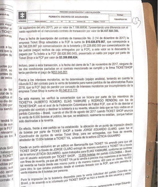 La Fiscalía se mantiene en que en el proceso de contratación resultaron beneficiadas empresas que no contaban con la experiencia para la venta de boletería de los partidos que la Selección iba a disputar, y los directivos de TicketYA y Ticketshop con el aval de la Federación Colombiana de Fútbol desviaron el propósito del contrato y destinaron la boletería a reventa.