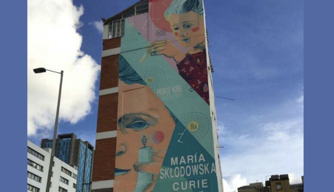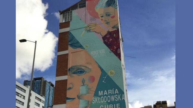 Marie Curie la científica polaca cuyo nombre completo es María Salomea Skłodowska-Curie es la imagen del mural que se acaba de develar en el centro de Bogotá. Es una obra gestionada por la embajadora de Polonia en Bogotá.