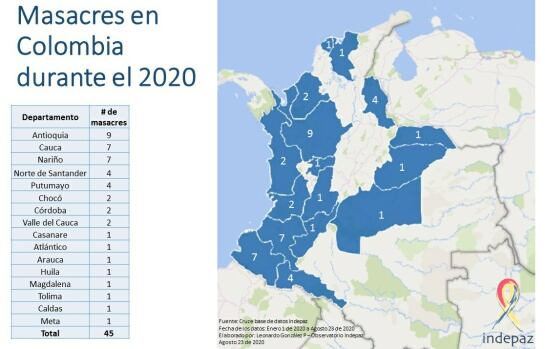Según un informe del observatorio de conflicto, paz y derechos humanos de Indepaz, en lo que va del 2020, 182 personas han sido asesinadas en 45 masacres que hasta hoy se han registrado en el país.