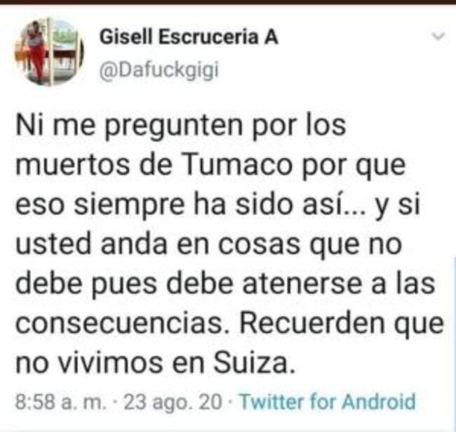 “Ni me pregunten por los muertos de Tumaco, porque eso siempre ha sido así... Si usted anda en cosas que no debe, pues debe atenerse a las consecuencias. Recuerden que no vivimos en Suiza”, escribió.