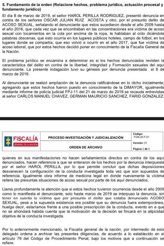El fiscal del caso consideró que la denuncia que se presentó en el año 2019, por el exárbitro Harold Perilla, contra Óscar Julián Ruiz fue extemporánea, habida cuenta que según la investigación, el supuesto acoso habría ocurrido entre 2009 y 2016.