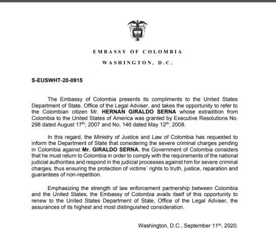 Caracol Radio conoció que, a través de los ministerios de Relaciones Exteriores y de Justicia, y la oficina del Alto Comisionado para la Paz, el Gobierno Nacional envió una nueva solicitud al Departamento de Estado de los Estados Unidos para que en los próximos días sean deportados Hernán Giraldo, conocido con los alias de ‘El Patrón’ o ‘El Señor de la Sierra’, y Éder Pedraza Peña, alias ‘Ramón Mojana’.