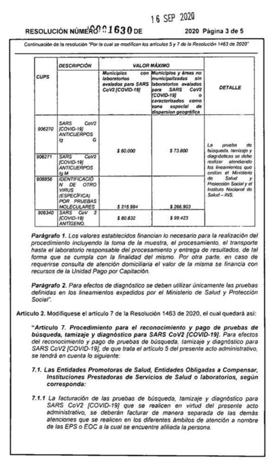 Luego de que los laboratorios que operan en Colombia, le exigieran al Gobierno Nacional ajustar los precios de las pruebas COVID-19, debido a que los establecidos en la resolución 1463, les parecían desactualizados. El Ministerio de Salud expidió una nueva normativa, en la cual se determina un precio más alto para las áreas no municipalizadas que además no cuentan con laboratorios para el procesamiento de las muestras.