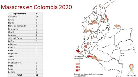 El Observatorio de Derechos Humanos, del Instituto de Estudios para el Desarrollo y la Paz, Indepaz, registra estas 61 masacres, las cuales se han registrado en su mayoría en Antioquia con 14, Cauca con 9, Nariño 9, Norte de Santander reporta 6 masacres y Putumayo 4. En estos hechos han asesinado a 246 personas.