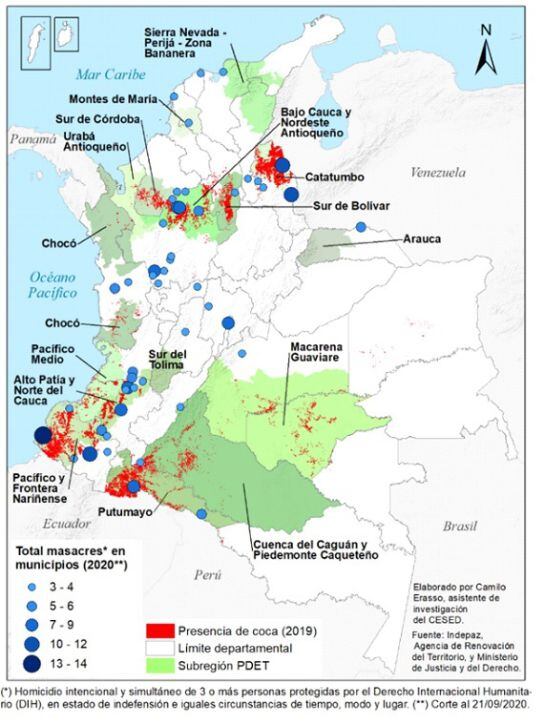 La presencia de los cultivos de uso ilícito no coincide espacialmente con todas las masacres ocurridas a lo largo de este año, así lo demuestra un mapa realizado por Camilo Erasso, asistente de investigación del CESED, basado en datos de Indepaz, la Agencia de renovación del Territorio y el Ministerio de Justicia.