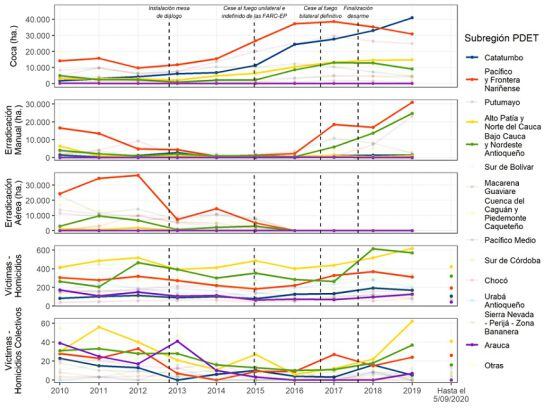 En otro de los gráficos realizados por el Centro de Estudios sobre Seguridad y Drogas de la Universidad de los Andes, se compara la evolución del área de cultivos de coca, erradicación manual y aspersión aérea, así como de las víctimas por homicidios totales y homicidios múltiples de las subregiones PDET desde el 2010 hasta el 5 de septiembre del 2020. Fue realizado con datos del Observatorio de Drogas de Colombia, , la Policía Nacional y la Agencia de renovación del territorio.