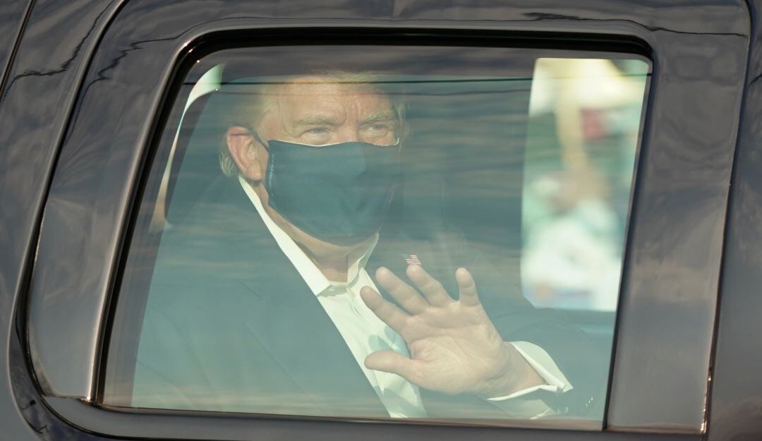 Usando tapabocas y a baja velocidad, el presidente de los Estados Unidos salió unos minutos del hospital en lo que calificó como “una visita sorpresa”