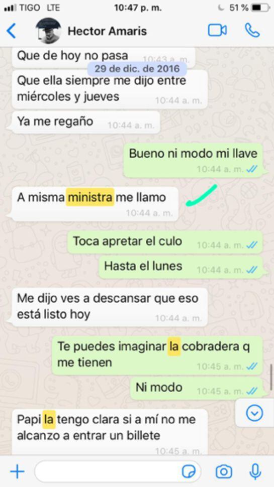 Posterior a esto, Héctor Amaris le escribe de nuevo al ganadero indicándole que la misma ministra lo llamó, que fuera a descansar porque el pago estaría listo el mismo día.
