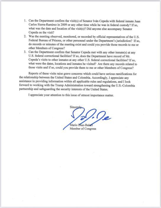 El congresista por el estado de la Florida pidió confirmar la vista de Cepeda y compartir cualquier información que exista sobre la misma como posibles grabaciones de su conversación de ese día o de otros encuentros.