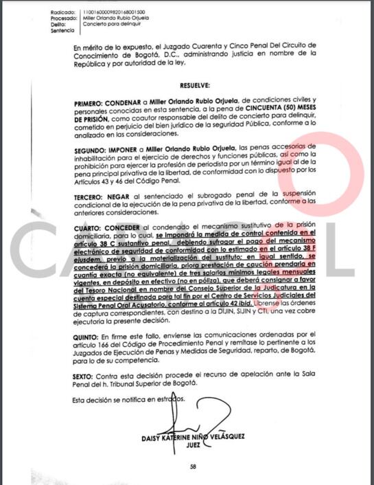 El fallo de 58 páginas señala que Miller Rubio, hizo parte de la organización criminal del clan de ‘Pedro Orejas’ y utilizó un noticiero de televisión de alcance nacional en el cual trabajó como periodista judicial, para publicar noticias falsas y así desviar las investigaciones que se adelantaban contra el esmeraldero.