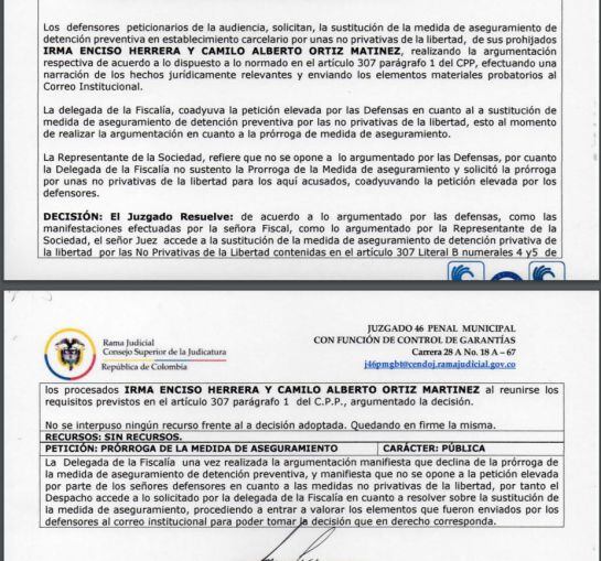 Se trata de Irma Enciso Herrera y Camilo Alberto Ortiz, a quienes el juzgado 46 de garantías de Bogotá les otorgó la libertad con el aval de la Fiscalía.