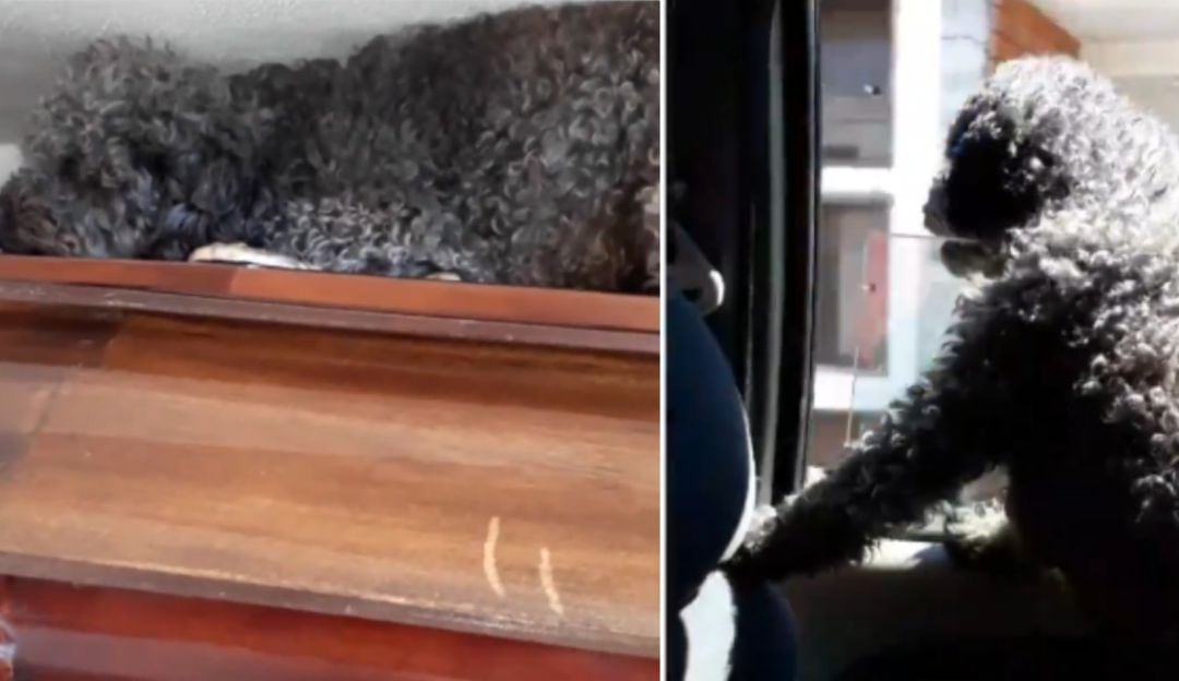 El animal se muestra ansioso todo el camino y cuando le dicen “vamos a ver a mamá” salta y ladra de emoción. Cuando llega al lugar, lo alzan para que pueda ver el féretro de su dueña y se acuesta sobre él todo el tiempo que dura la visita.