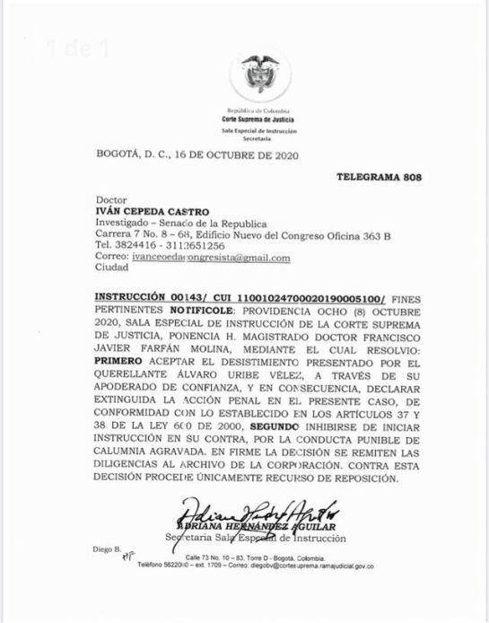 En su momento la Corte ordenó investigar a Uribe y el día de hoy le llegó una notificación al congresista Ivan Cepeda, de parte de la Corte Suprema en la que acepta la decisión de Uribe desistir de su denuncia presentada en 2019.