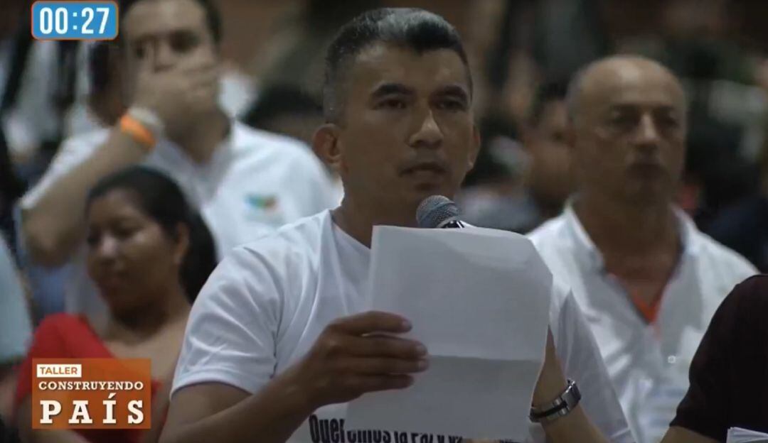 Allí, Juan de Jesús Monroy Ayala, conocido en el conflicto armado como Albeiro Suárez, en su intervención de tres minutos, denunció ante el mandatario condiciones de inseguridad, habló de la falta del compromiso del Gobierno Nacional para apoyar la sustitución de cultivos ilícitos en la región y le pidió cumplir con la implementación de los Acuerdo de Paz.