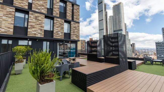 Todos los apartamentos vienen completamente amoblados con cama, armario, televisor, sala – comedor, estufa, nevera, horno eléctrico y microondas –. Pero atención, el canon de arrendamiento incluye: wifi, servicios públicos y acceso a todas las zonas comunes que están compuestas por terrazas, zonas de BBQ, gimnasio, salas de estudio, espacios de co-working, taller de arte, techlab y piscina, entre otras.