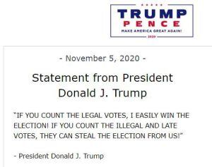 El primer comunicado dice en mayúsculas “si cuentan los votos legales, ¡yo gano fácilmente la elección!, si cuentan los votos ilegales y tardíos, ellos pueden robarnos la elección”.