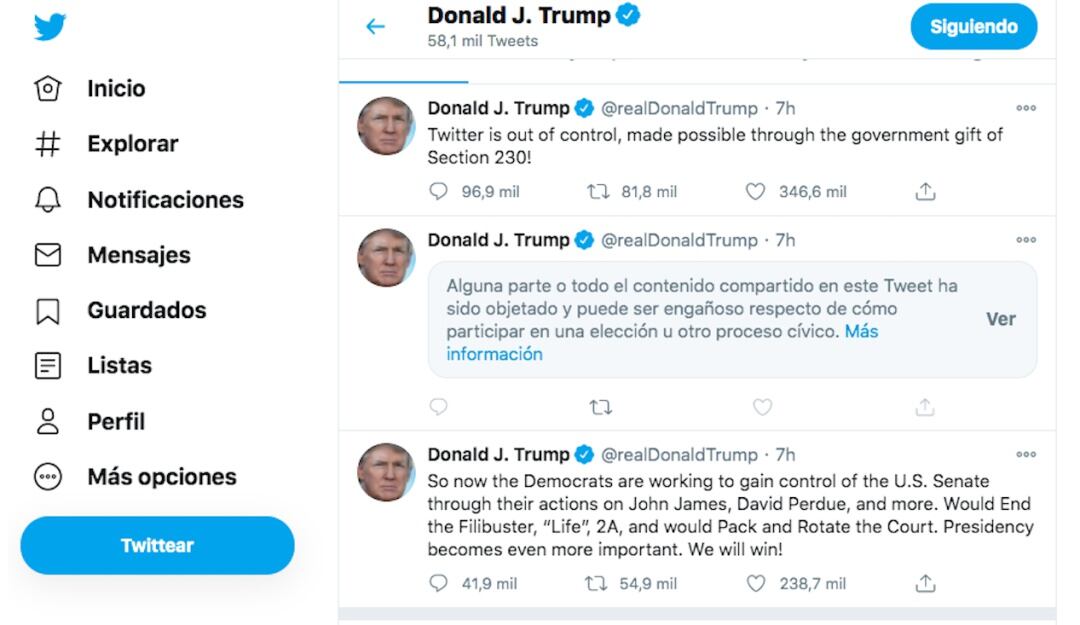 El presidente de Estados Unidos ha estado empleando su cuenta de Twitter para hacer afirmaciones sobre fraude electoral o sugiriendo que había ganado las elecciones en estados en los que todavía no se había terminado el recuento de votos.