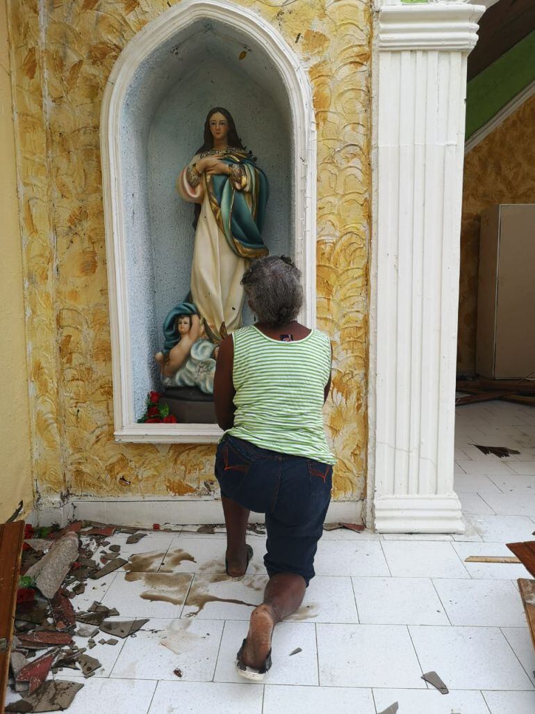 En un recorrido por la devastada isla de Providencia, llegamos hasta la iglesia Reina de los Ángeles, donde cada domingo a las 5:30 de la tarde, se celebraba la misa. En medio de los escombros nos encontramos con Teresa Davis, una mujer de 72 años, estaba arrodillada rezando ante la virgen de los Ángeles, que quedó intacta tras el paso del huracán Iota.