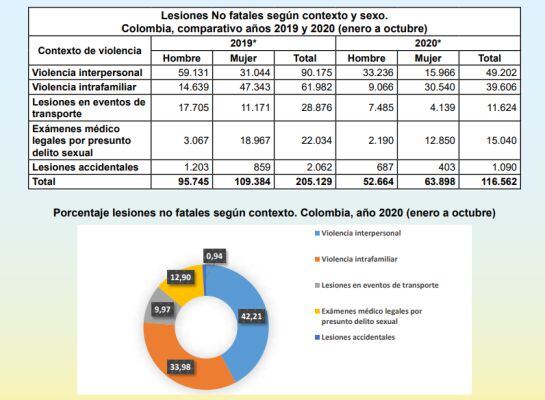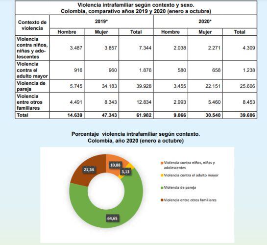 De acuerdo al último reporte de Medicina Legal, con corte al mes de octubre, 22.151 mujeres han sido víctimas de violencia por parte de su pareja sentimental, 12 mil casos menos a comparación con el mismo periodo del año 2019. Las ciudades capitales con más casos registrados son Bogotá, Medellín, Cali y Barranquilla.