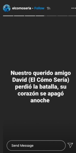Este lunes, por medio de esta misma cuenta, se hizo oficial que David falleció: "hola a todos, hoy tengo que darles una muy mala noticia. Nuestro querido amigo David (elcómosería) perdió la batalla, su corazón se apagó anoche. No habíamos podido publicar nada por respeto a su familia".