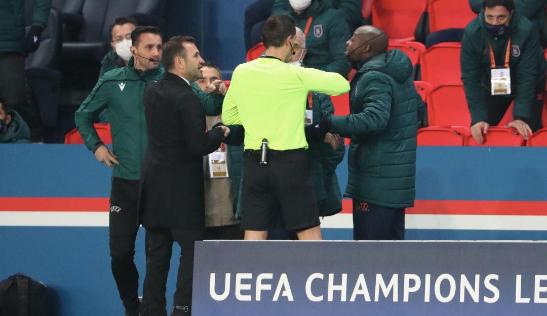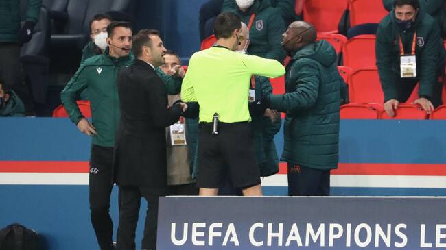 El banquillo turco se indignó, y dirigidos por el franco-senegalés Demba Ba, se agudizaron las protestas pese a que Coltescu trataba de explicar que no era una expresión racista. Los jugadores del PSG también se implicaron y al final ambos equipos se retiraron del césped del Parque de los Príncipes.