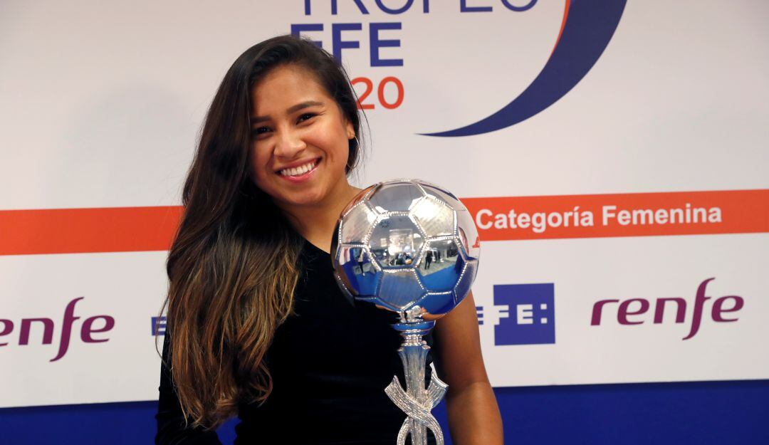 La futbolista Leicy Santos recibió este viernes el Trofeo EFE, que la condecora como la jugadora latinoamericana más valiosa de la temporada 2019/20 tras ganar los Juegos Panamericanos de Lima con la Selección Colombia y quedar subcampeona de la Primera División española con el Atlético de Madrid.
