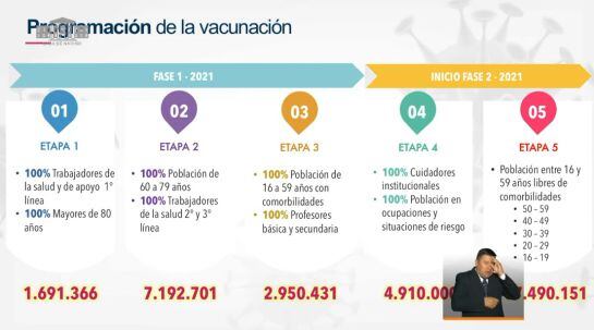 "Vamos a tener 5 etapas para la vacunación. La primera será para trabajadores de la salud y logística. La segunda será para adultos de 60 a 79 años", informó.
